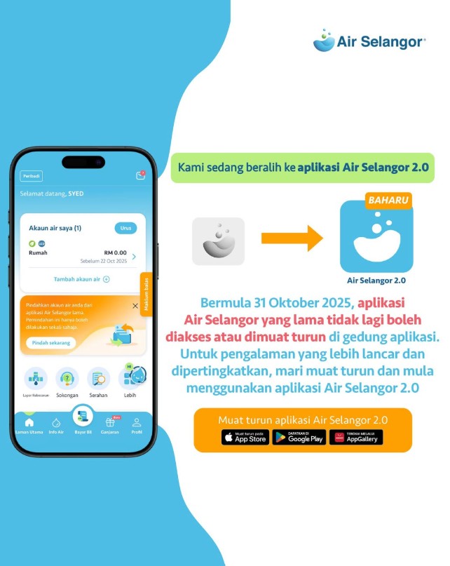 Bermula 31 Oktober 2025, aplikasi Air Selangor yang lama tidak lagi boleh diakses atau dimuat turun di gedung aplikasi. Untuk pengalaman yang lebih lancar dan dipertingkatkan, mari muat turun dan mula menggunakan aplikasi Air Selangor 2.0